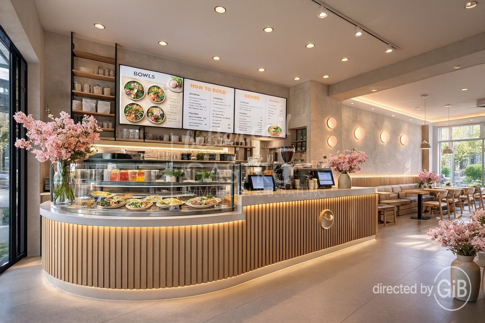 Die Ausstattung wirkt hochwertig und zeitgemäß: ein harmonisches Zusammenspiel aus Holz, warmen Farbtönen und eleganten Lichtakzenten schafft eine Umgebung, die sowohl für den schnellen Coffee-to-go als auch für den entspannten Lunch geeignet ist. Der großzügige Thekenbereich ermöglicht eine effiziente Arbeitsweise und setzt zugleich einen gestalterischen Fokus im Raum.